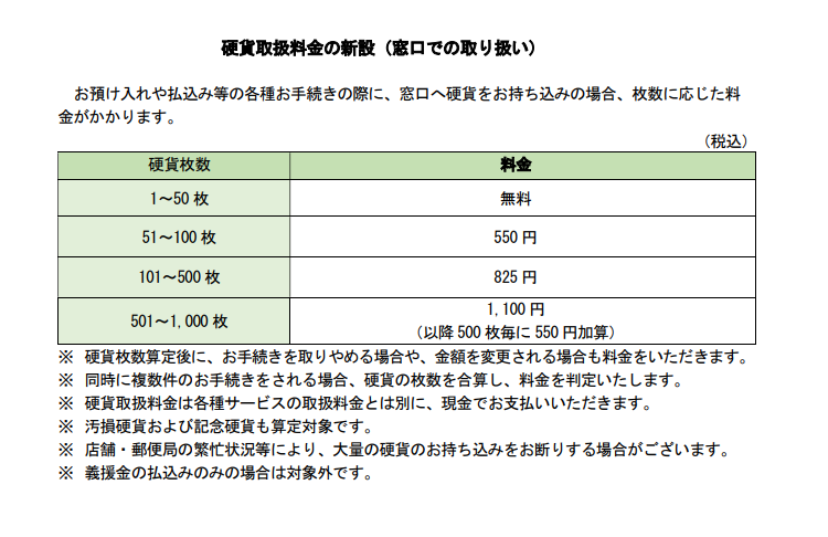 郵便局での硬貨取引手数料の新設