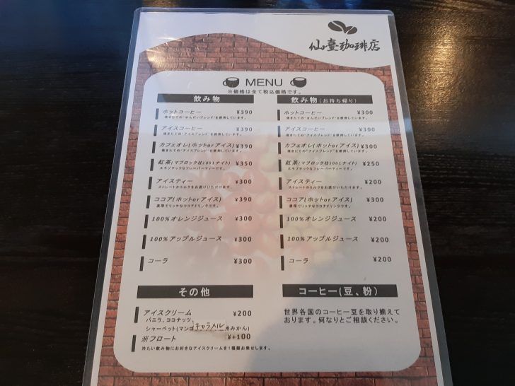 珈琲豆は、少し値上がりしましたが、下記の通り、カフェメニューは値上がりしていないです。