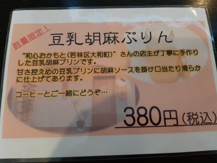 これは新メニューの「豆乳胡麻プリン」です。マスターと奥様が、時々行く若林区大和町にある和食の店『和心 おかもと』の店主さんが、手作りした「豆乳胡麻プリン」で、食べに行った時には必ず注文するというスイーツです。余りにも美味しいので、『仙臺珈琲店』でも提供することにしたようです。但し、数量限定なので、売切れになっていることもありますとのこと。