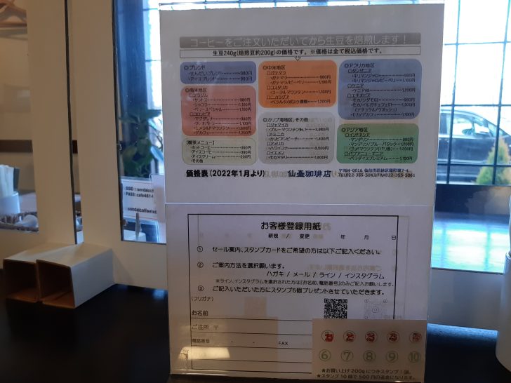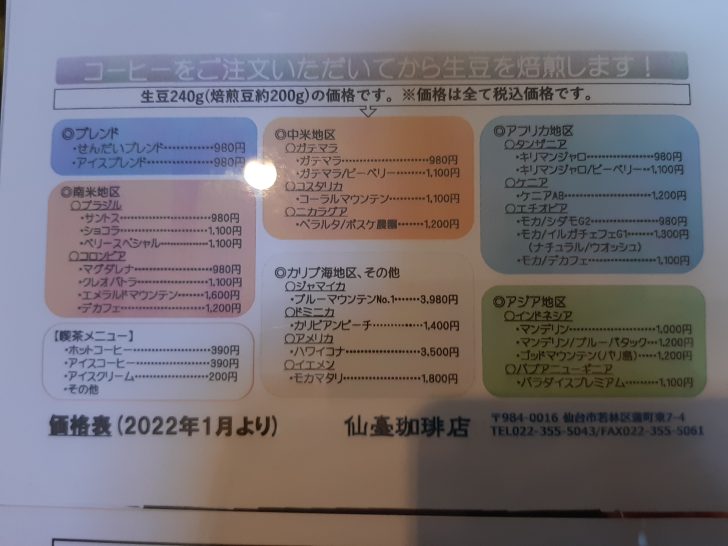 insrtagramでもアナウンスされていましたが、コロナの影響で珈琲豆・輸送費が値上がりした為、2022年1月~珈琲豆の価格が値上げになりました。どのぐらい値上げになったかというと、定番のせんだいブレンドが880円⇒980円と100円値上げ。他も200gで100円程度の値上げとなったようです。これは、仕方ないですね。