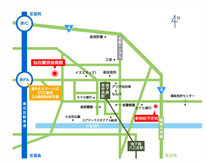 ◆『新仙台徳洲会病院』は、泉中央駅より、東に約1.5㎞(徒歩20分)の所にあります。泉中央駅からバスで行く場合は、宮城交通バス:松陵ニュータウン線「高玉町」停留所で下車すると徒歩1分です。