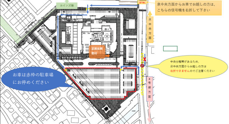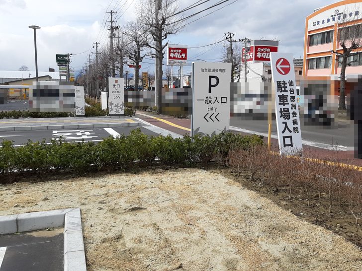 赤枠の所がお客様駐車場となっているようです。国道4号線方面からは、左折で駐車場に入ることになりますが、泉中央方面からは、カインズ泉店との間の信号を右折して入口から入場して病院の後方を通って駐車場に入るようになるようです。
