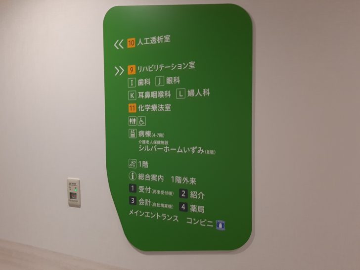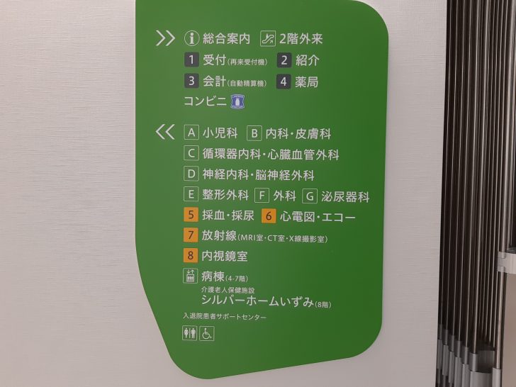 1Fは総合案内、受付、紹介、会計、薬局の窓口があります。また、コンビニ(ローソン)もあります。各診療科と放射線科、内視鏡室、ER(救急救命室)などがあります。