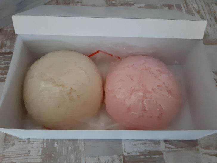 更にこんなに大きい紅白のお饅頭を頂きました。自宅に持ち帰ったら、こんなに大きい紅白饅頭は、最近見た事がないと驚いていました。家族で美味しく頂きました。