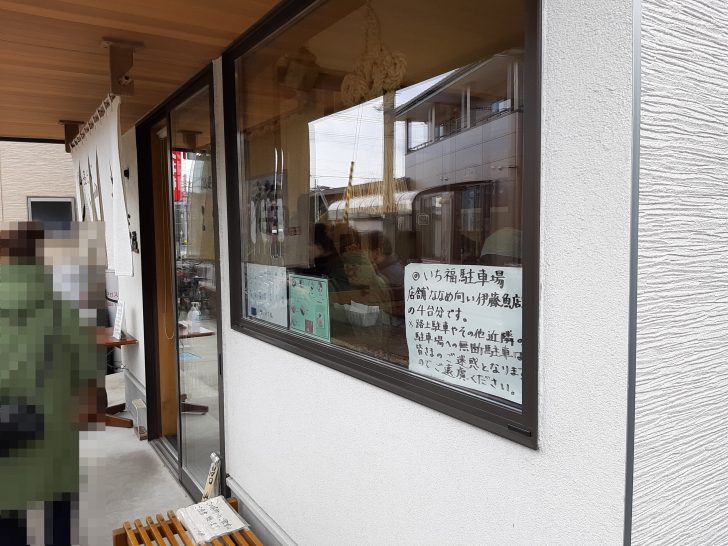仙臺だんご『いち福』の駐車場は、店舗の斜め向かいの伊藤魚店の前に4台分ありますが、休日には混雑します。その場合は、とりあえず、お店を通り過ぎて伊藤魚店のスペースに右折して車を入れます。そうすると駐車場案内の方がいるので、その方の指示に従って下さい。駐車場に空きがない場合は、空く迄に他のスペースに一時停車して待つことになります。この時は少し待っただけで、1台分空いたのですぐに駐車できました。回転は良さそうなので、駐車場が満杯でも少し待つと駐車できそうですね。