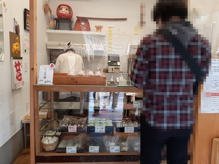春らしい和菓子(いちご大福、道明寺、うぐいす餅)がたくさん並んでいました。