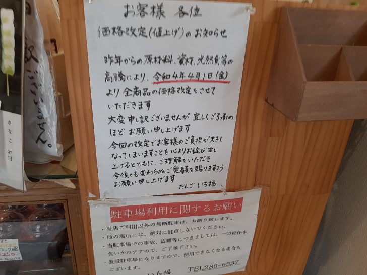 原材料、資材、光熱費等の高騰により、令和4年4月1日より、全商品が値上げされるとの貼紙がありました。
