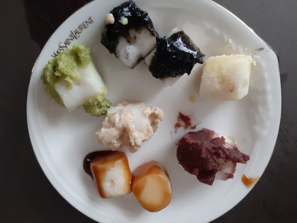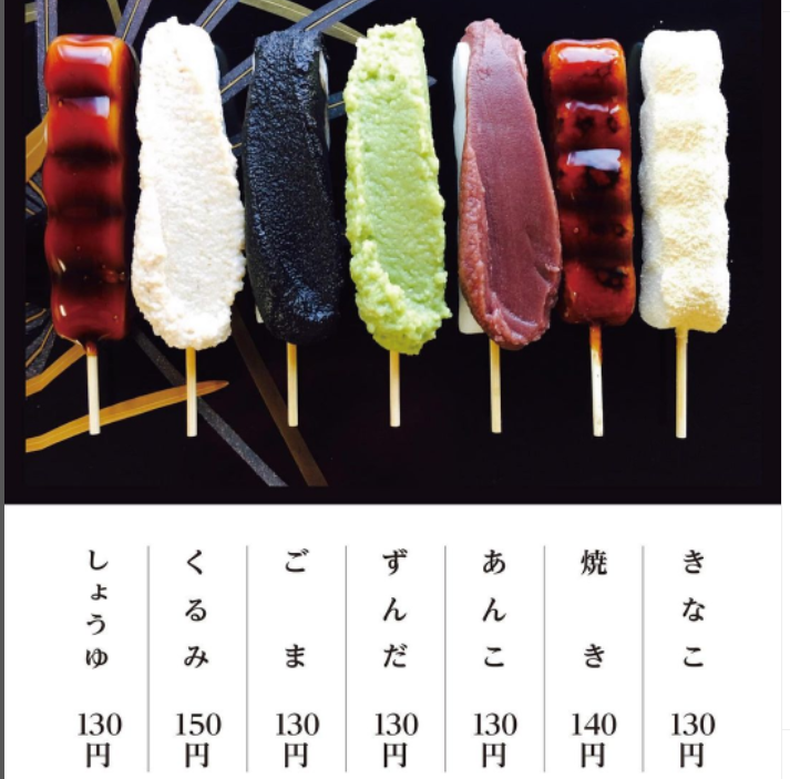 ◆ 餡は七種類(しょうゆ、くるみ、ごま、ずんだ、あんこ、きなこ、焼き)で注文を受けてから餡をつける。