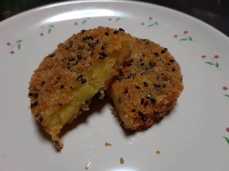 これがおさつコロッケで、さつまいもの甘さと衣の黒ゴマの相性が良く美味しいですね。