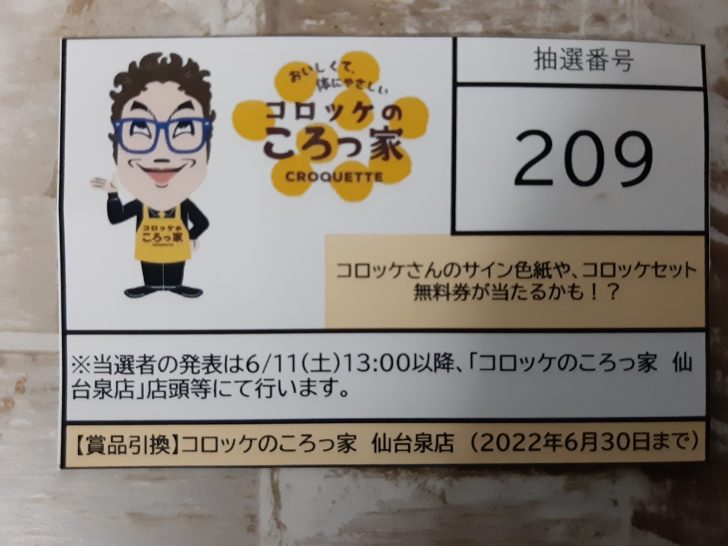 今回は999円以上購入したので、次のような抽選券を貰いました。6/11(土) 13:00に『コロッケさん』が来店される時に抽選があるので、是非行ってみたいと思います。尚、抽選券は6/10(金)まで貰えるようなので、一度食べてみたいと思っている方は、早めに行って下さい。また個人的には、特製ビーフコロッケと特製ジューシーメンチカツは美味しいと思いましたが、コスパはあまり良くないですね。