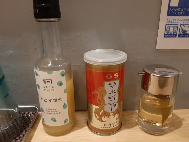 卓上調味料は、ラーメンコショー、酢、かぼす果汁の3種類でした。ラーメン店でかぼす果汁というのは、初めて見ました。酢とかぼす果汁はつけそば用のようですね。