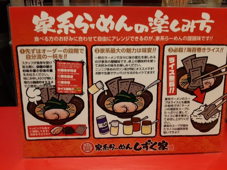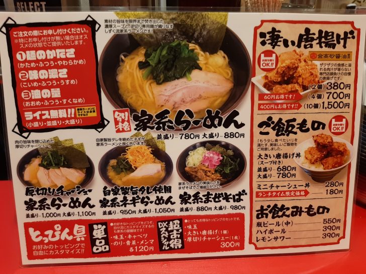 他の家系らーめん店と同じように麺の硬さ・味の濃さ・油の量を選択できるのですが、今回は、➊麺の硬さ:硬め、➋味の濃さ:濃いめ、❸油の量:ふつうにしました。また、ライスは無料(小、中、大)だったのですが、糖質をできるだけ控えている為、注文しませんでした。