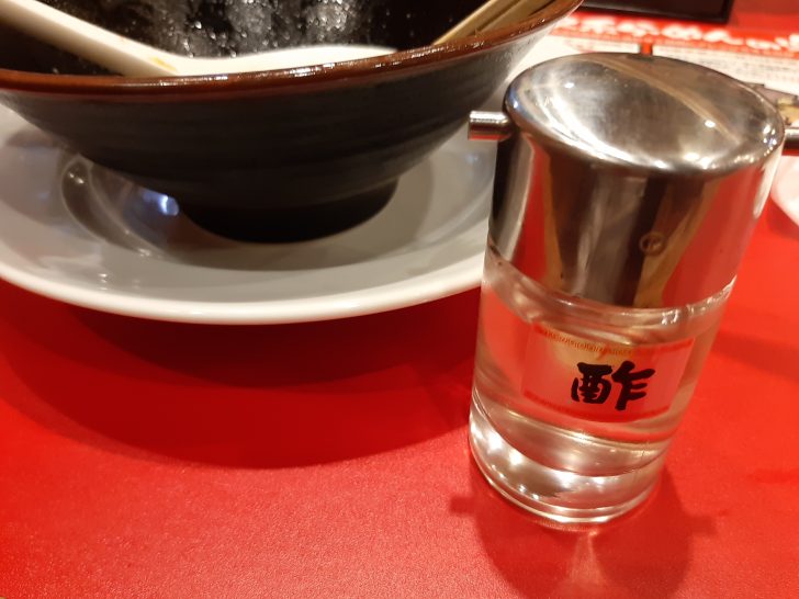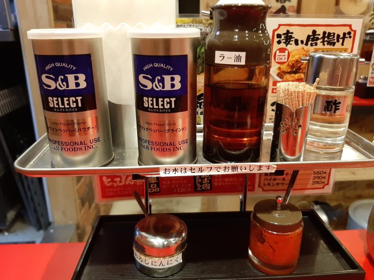 卓上調味料は、ホワイトペッパー、ブラックペッパー、ラー油、酢、おろしにんにく、豆板醤がありました。生姜が欲しい場合は、店員さんにお願いすると提供されるようです。