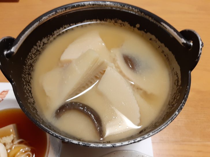 季節のお料理は、春なので孟宗汁でした。固形燃料で温めて頂きます。地元鶴岡では有名な料理で、昔からこの季節には食べていた、私も大好きな料理です。