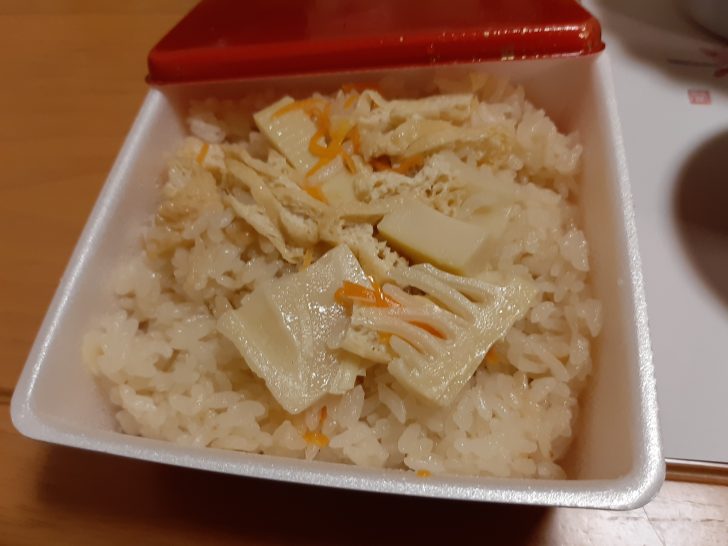 本日の御飯は旬のタケノコ御飯です。味付けも良く、間違いない美味しさでした。