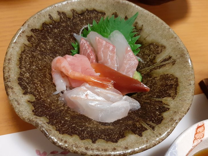 これはお刺身の盛合せですが、ひらめ、甘えび、まぐろ、ホッキ、鯛でした。