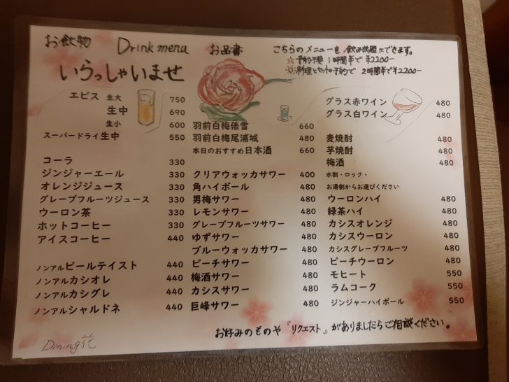 こちらは、ドリンクメニューです。飲み放題もできるようです。予約不要で90分で【2,200円】のようです。また、料理とセット予約の場合は150分【2,200円】とお得になるようです。