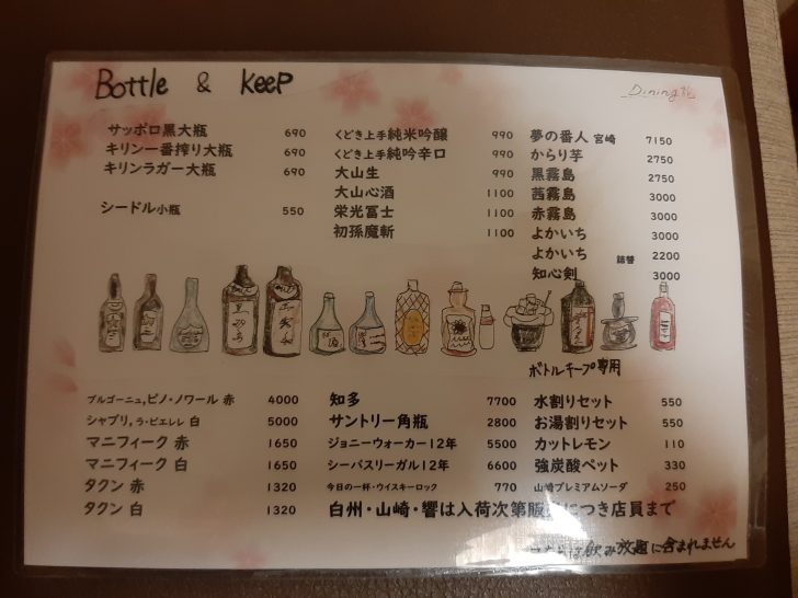 日本酒は、美味しい地酒も色々揃っているようですが、少し高めですね。焼酎・ウィスキーはリーズナブルにボトルキープできるようですね。