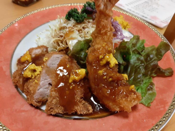 次の料理は、揚げたてのヒレカツと海老フライです。お店の自慢のメニューだけに、米粉を使用した薄めの衣の食感が良く、厚いヒレ肉が柔らかくとっても美味しいです。海老フライも大きめで食べ応えがありました。また、とんかつソースが『Dining 花』の自家製ソースらしく、甘めでスパイシーで美味しかったですね。