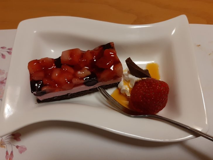 最後はデザートで締めです。フルーツタルトと苺でした。あんまり甘いものが得意ではない僕でも、凄く美味しかったです。