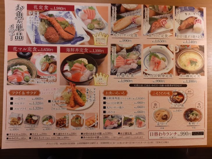 これはお魚&単品メニューですね。人気NO1は「花定食」【1,980円(税込)】のようです。これは旬の刺身とヒレカツ・海老フライ等の揚げ物が両方食べられる欲張りメニューのようです。他には海鮮丼や焼き魚定食がありますね。
