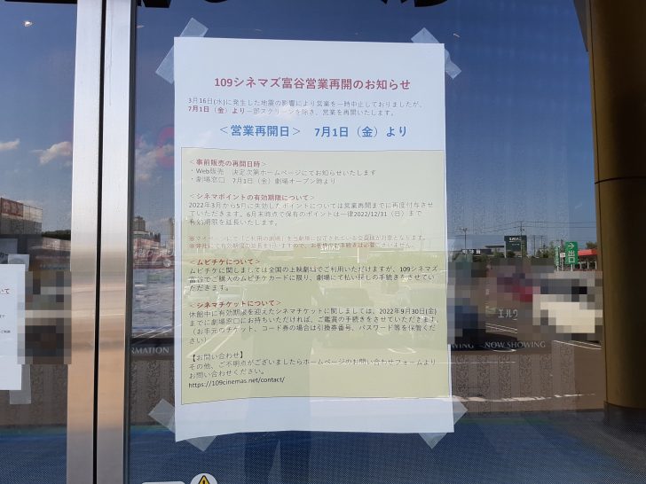 正面玄関には7月1日(金)より『109シネマズ富谷』営業再開の貼紙が貼ってありました。