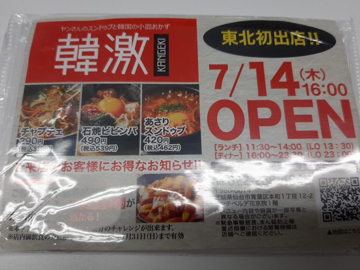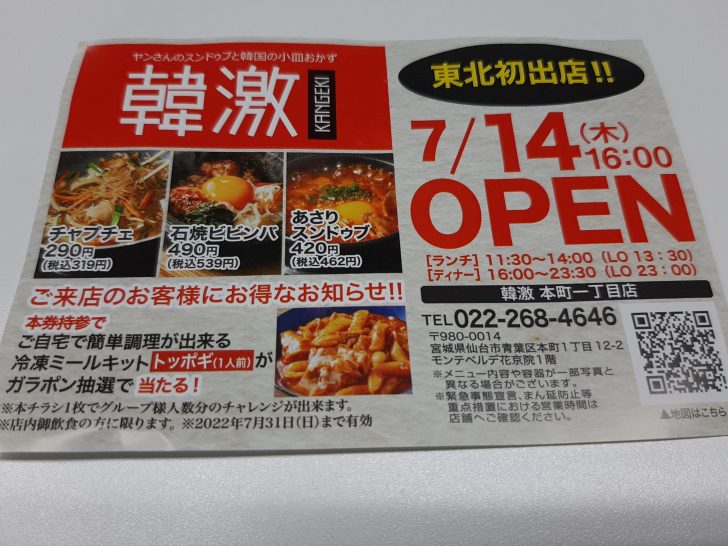 本日7月14日(木)16時に、韓激本町一丁目店が仙台に新規オープンいたします!皆様のご来店を必死にお待ちしております。本日は朝7時30分より仙台の街でチラシ配りをいたしました。街の暖かさを感じました!#韓激本町一丁目店#韓激激安激旨 pic.twitter.com/GzuAnJQJzu— 韓激 (@kangeki373) July 14, 2022