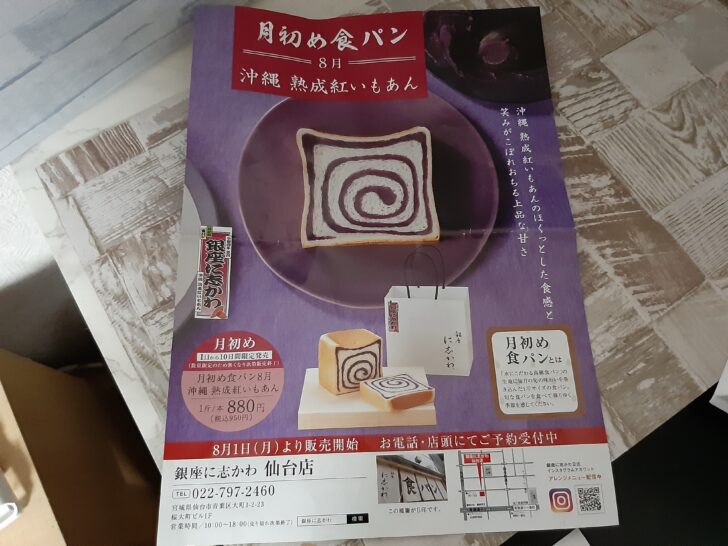 高級食パン専門店『銀座に志かわ仙台店』がには、2020年11月のオープン直後に行ったきりで、その後は行く機会がありませんでした。なので、その間に「あん食パン」や「月初め食パン」等の新たなメニューが増えていることは知りませんでした。今回は勤務先へのポスティングで知ったのですが、毎月替わる「月初め食パン」は次回も買ってみたいと思います。