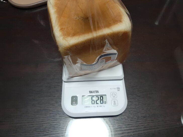 持って見ると1斤の食パンなのに、ずっしりと重く感じました。重量を図ったら628gもありました。これは、紅いもあんがタップリ入っているからですね。