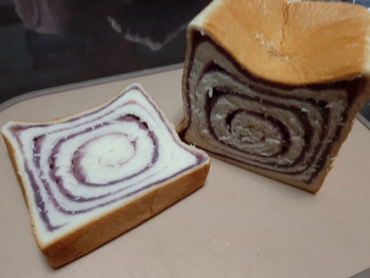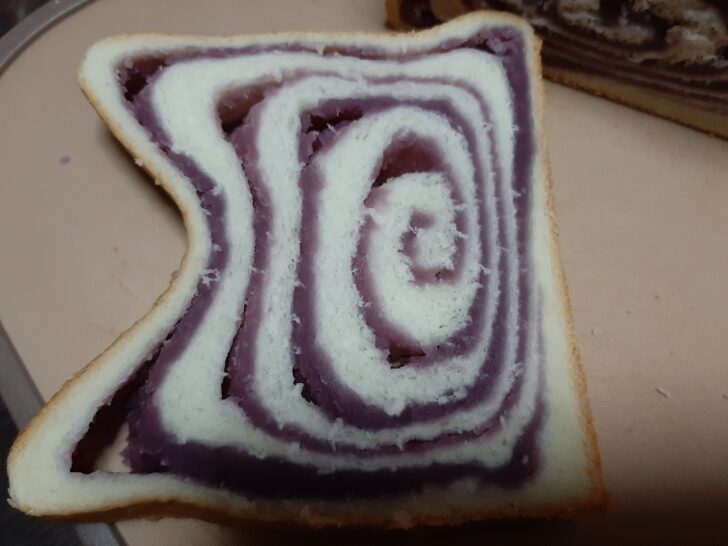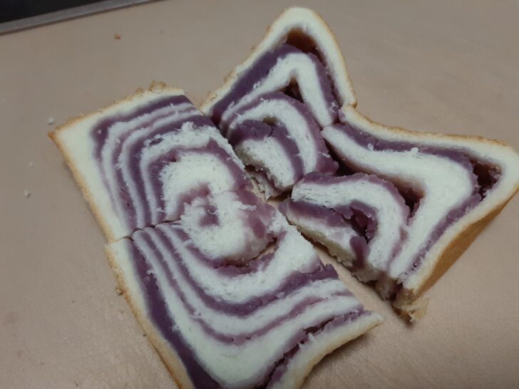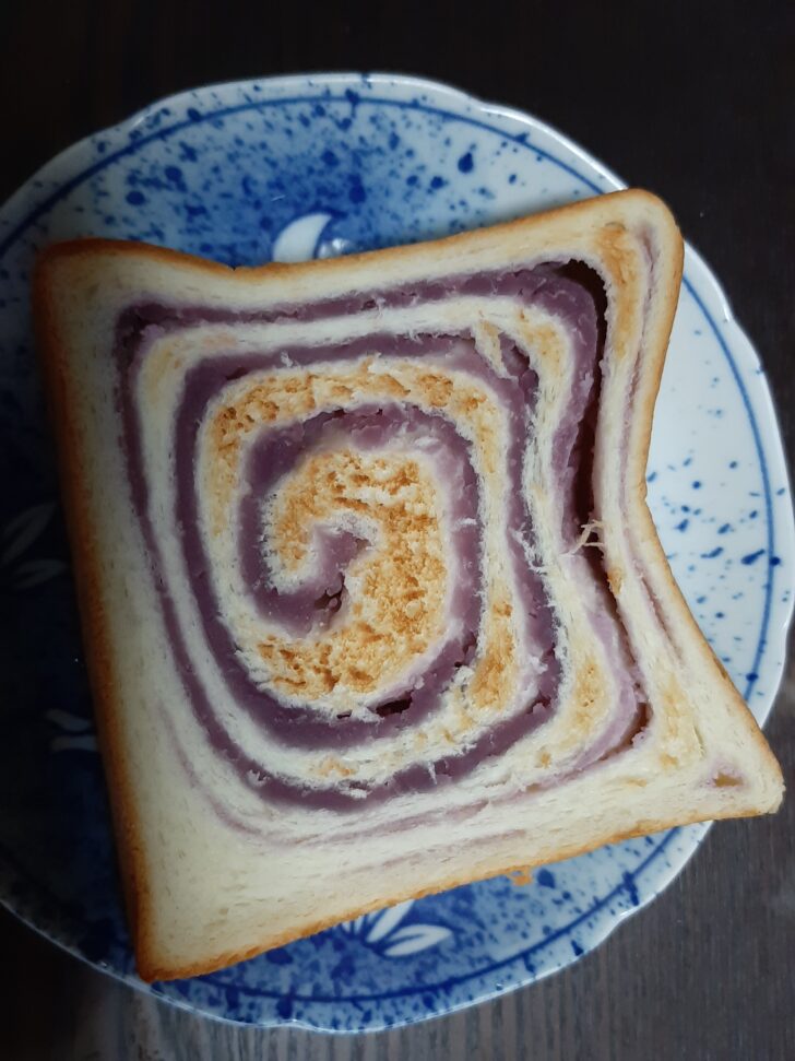 このようにカットして食べましたが、本当に沖縄産の紅いもあんが、上品な甘さで、「和菓子」のような食パンでした。家族全員が、美味しいと大絶賛でした。