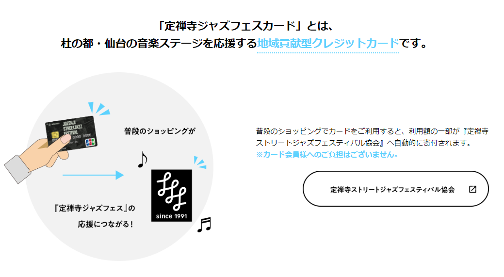 定禅寺ジャズフェスのカードとは、どんなカードかというと、日専連ライフサービス(仙台)が、発行している地域貢献型クレジットカードで、通常のショッピングでカードを利用すると、利用額の一部が定禅寺ジャズフェスティバル協会へ自動的に寄付されるというものです。