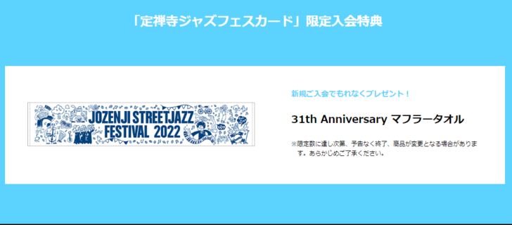 日専連の定禅寺ジャズフェスカードに入会すると、第31回定禅寺ジャズフェス2022のマフラータオルが貰える特典があります。