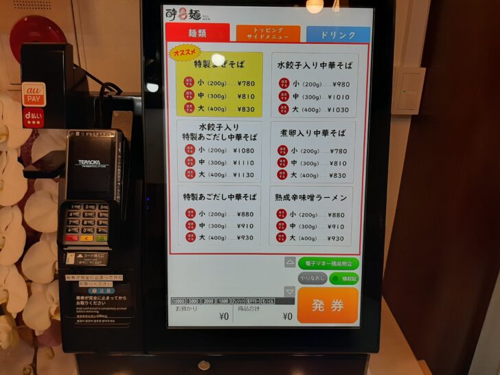 入店するとすぐ右側に食券の券売機があります。クレカ、auPAY、d払いなどのキャッシュレスが利用できますが、この手の券売機は、慣れないとメニュー選択から発券までに時間が掛かるので、あまり好きじゃないですね。