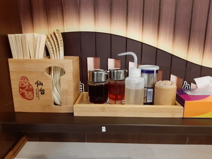卓上調味料は醤油、ラー油、酢、ブラックペッパーですね。