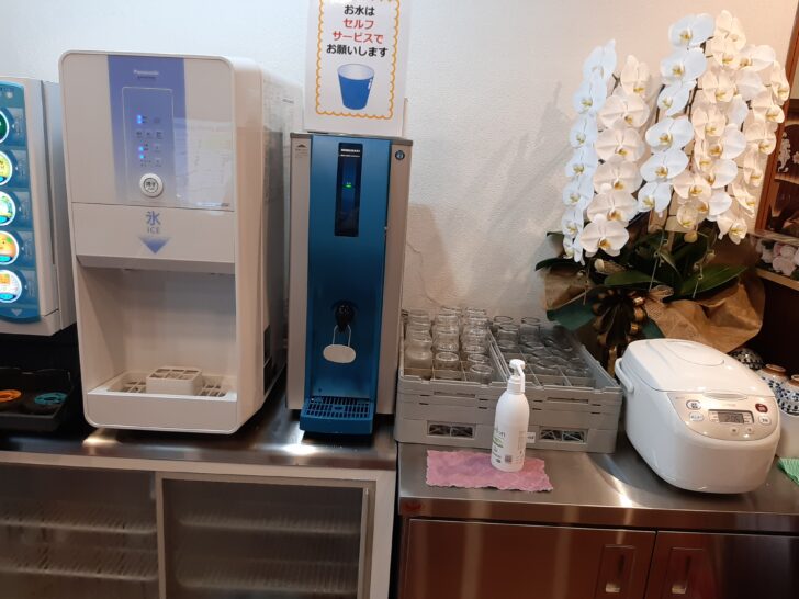 お水はセルフサービスになっています。氷と水のサーバーが別々になっています。確認はしていませんが、炊飯ジャーが置いてありましたが、これはセルフで御飯お替りが可能ということかも知れません。