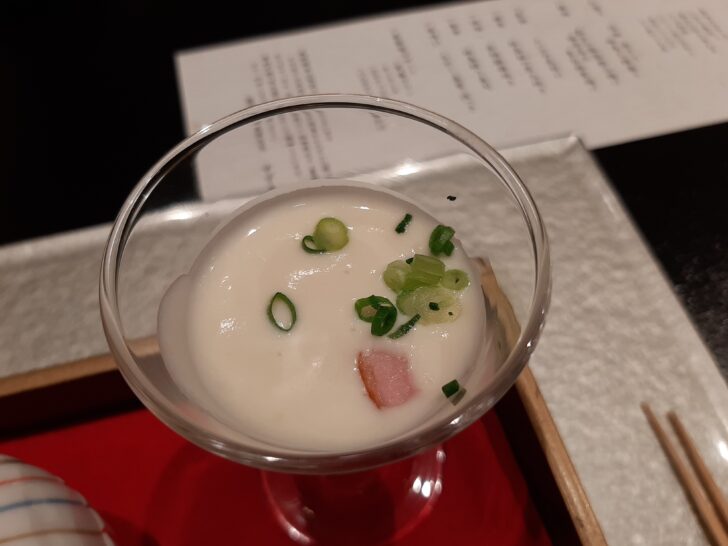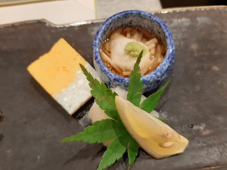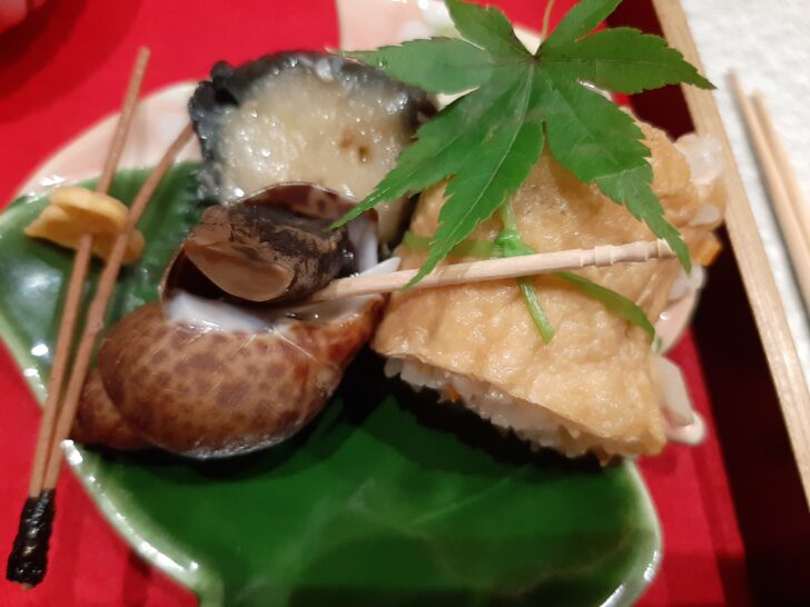 前菜は、玉ねぎのムース、いなり寿司、茄子の炊き合わせ、そば松葉、ぶどうと梨の白和え、長芋イクラのせ、バイ貝のうま煮でした。
