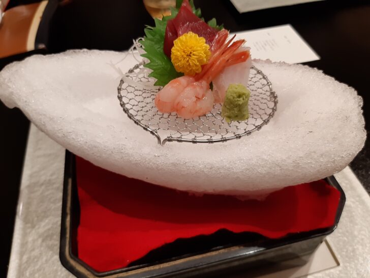 お造りは、地魚三種盛りで、マグロ、甘えび、マコガレイでした。雪の船に載せられて出てきました。