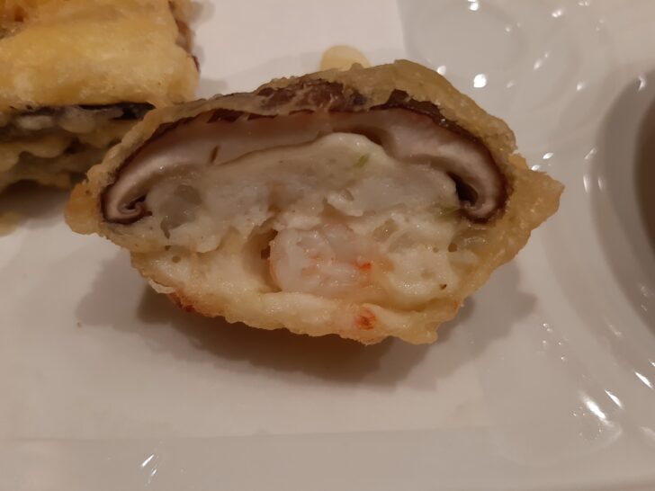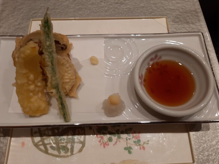 揚げ物は天ぷらでした。パプリカ、いんげん、さつまいも、海老真丈裏白椎茸です。