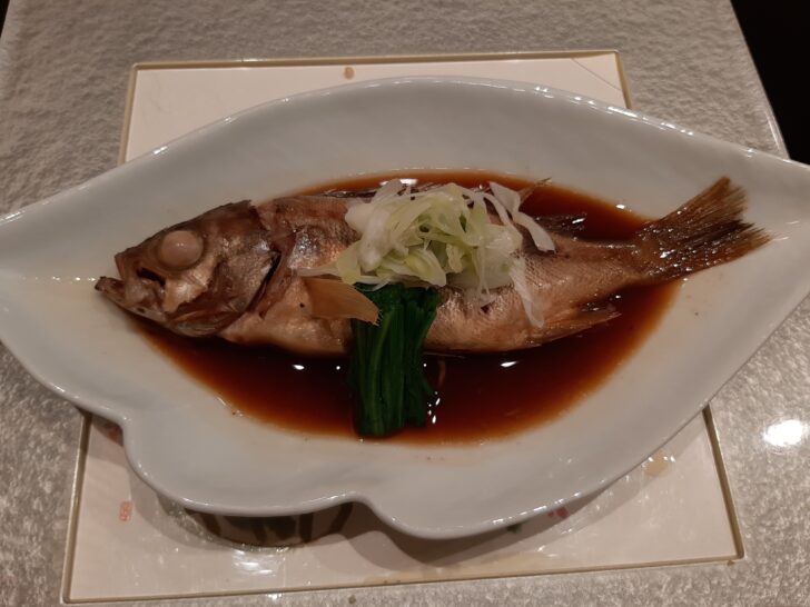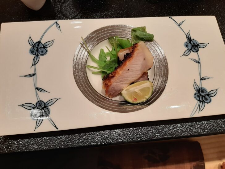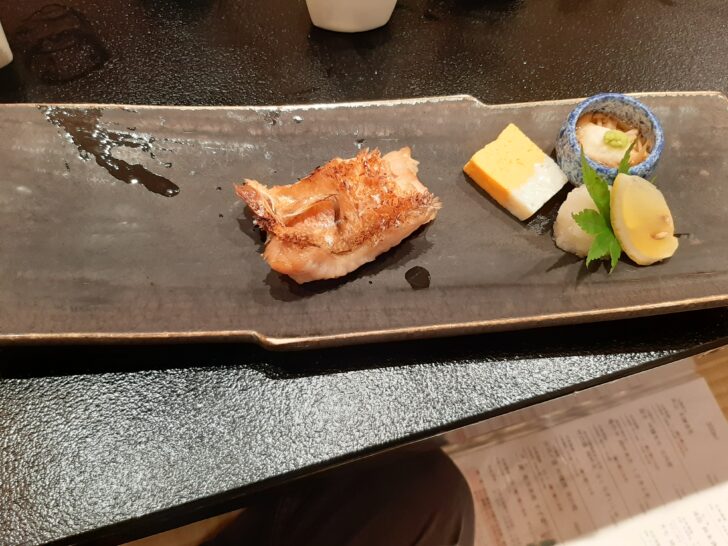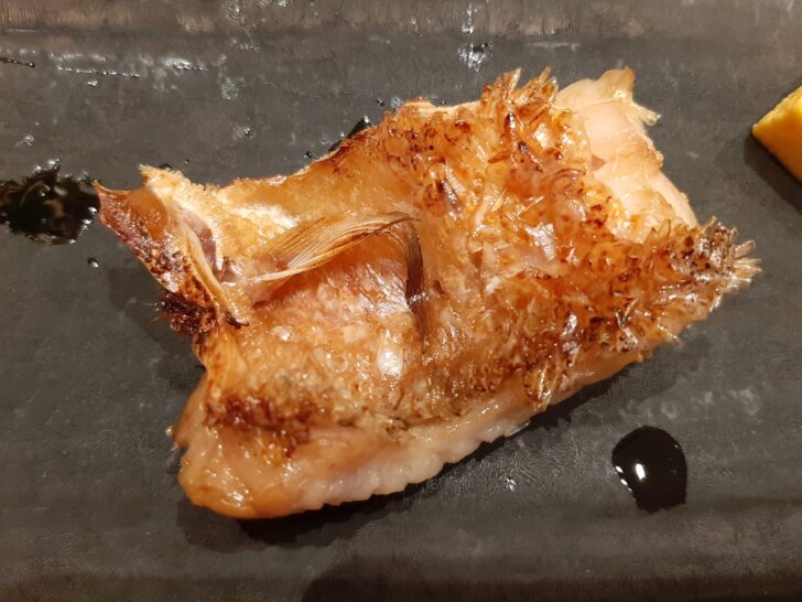 焼物は、甘鯛麒麟焼きでした。麒麟焼きというのは、鱗焼きのことですね。鱗がサクサクに焼かれてあり、柔らかい身との食感の違いが良いですね。