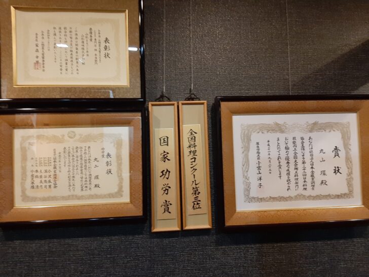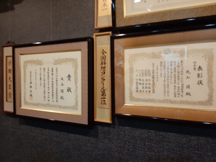 店主の丸山さんの全国料理コンクール1位・3位などの表彰状がたくさん掲示されていました。