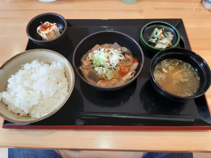 一番人気の『もつ煮定食』を注文しました。御飯は、並盛り(220g)と大盛り(320g)を選択できます。食券を店員の方に渡す時に、並盛りか大盛りを聞かれるので、どちらかを選択します。定食の内容は、もつ煮、御飯、味噌汁、冷奴、漬物ですね。