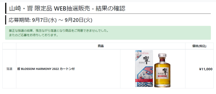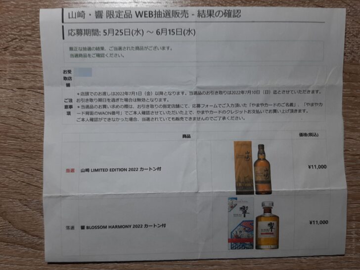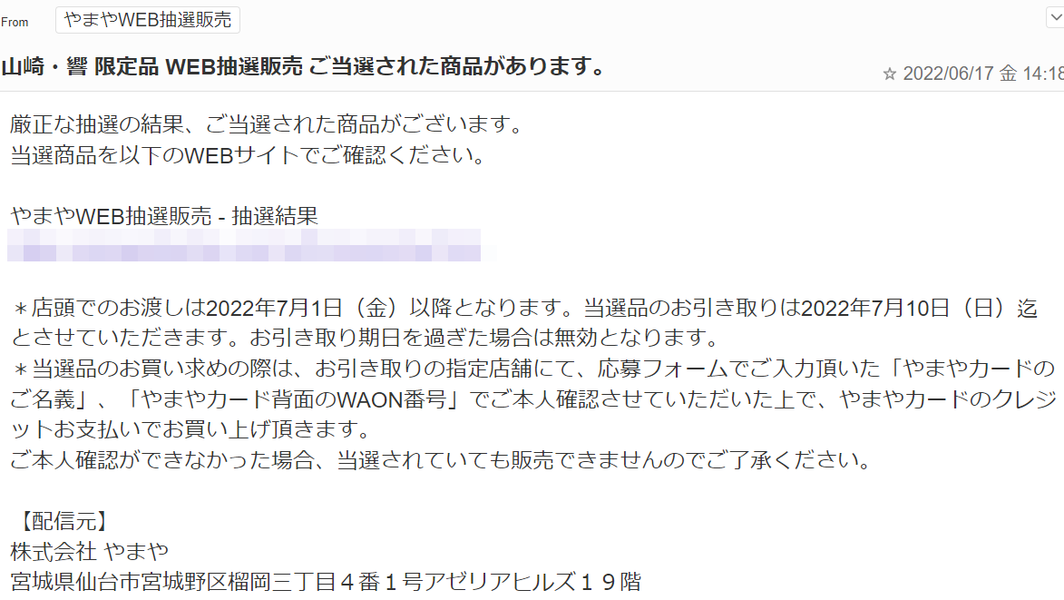 まさかと思いましたが、2022年5月25日(水) ~ 2022年6月15日(水)のWEB抽選で、響ブロッサムハーモニー2022は落選しましたが、山崎 LIMITED EDITION 2022 が当選しました。 次のような当選メールがきたので、びっくりしました。