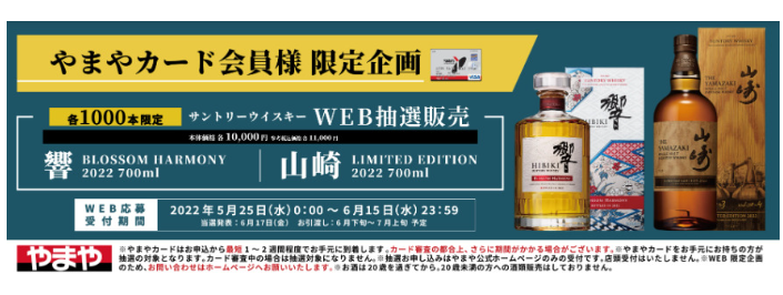 「山崎リミテッドエディション」は、2014年から、『響ブロッサムハーモニー』は2021年から毎年数量限定で、販売されるようですが、2022年も限定品の『山崎リミテッドエディション2022』、『響ブロッサムハーモニー2022』が、百貨店、スーパー、酒屋等いろいろな所で、抽選販売されています。『酒のやまや』でも、2022年は、5月~6月にWEB抽選販売を行いましたが、9月~10月に2回目のWEB抽選販売が行われました。しかも、定価販売(11,000円)で購入できるのが良いですね。通常では入手が難しいだけでなく、amazonやメルカリ等では数万円と超プレ値でやり取りされていますね。