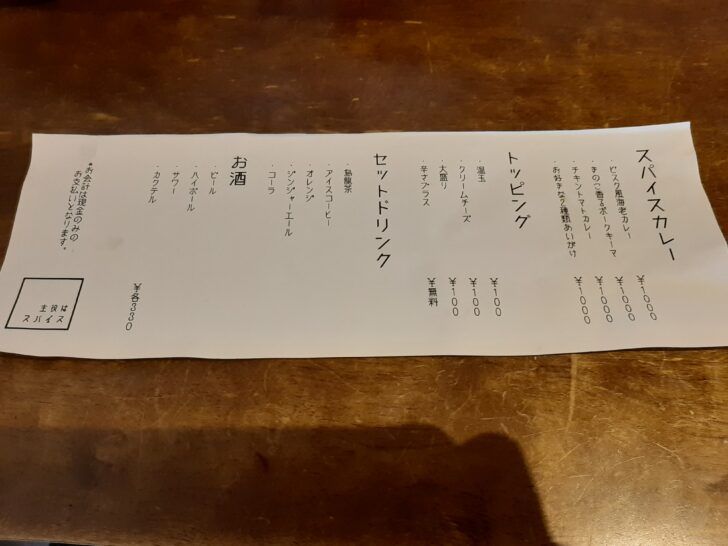 メニューはこちらですね。スパイスカレー3種類の中でビスク海老カレーはレギュラーメニューのようです。他の2種類は、変更されるようです。トッピングは、温玉、クリームチーズ、大盛りが各100円です。辛さプラスは無料です。