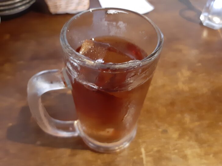 今回は、「ビスク風海老カレー」「きのこ香るポークキーマ」のあいがけ+温玉のトッピングを注文。辛さは0辛/中辛/辛口/激辛の四種類から選べますが、辛口を選択。セットドリンクは烏龍茶を選択しましたが、ジョッキで提供されました。
