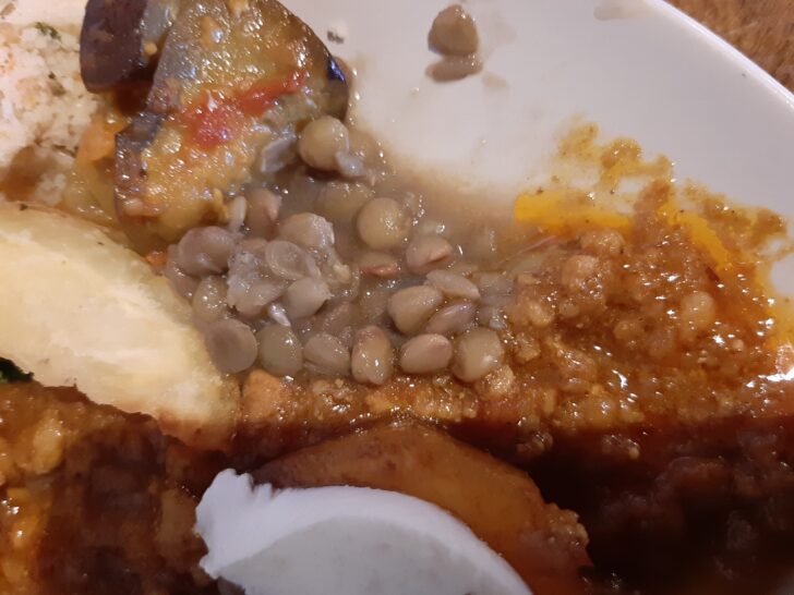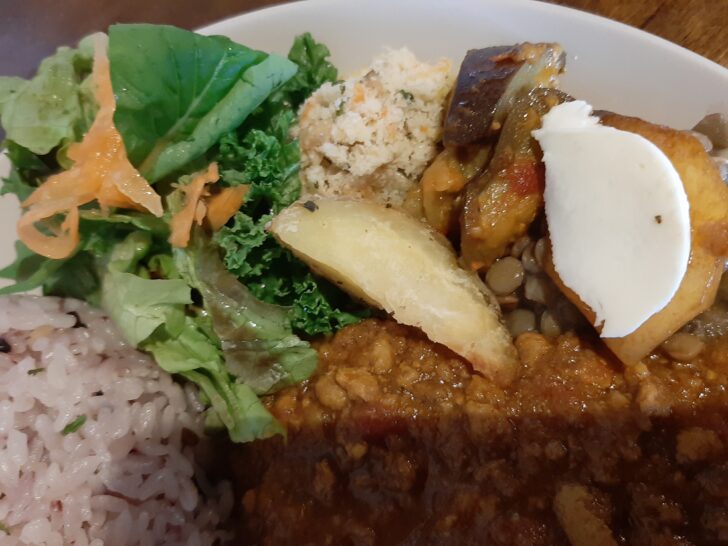 付け合せは、レタス、サニーレタス、人参のサラダで酸味のあるドレッシング掛けられたもの。それから、おから、じゃがいも、茄子の炒め物、柿のチーズのせ、それからなんの豆か分かりませんが載っていました。どれも手が込んでいて美味しいですね。