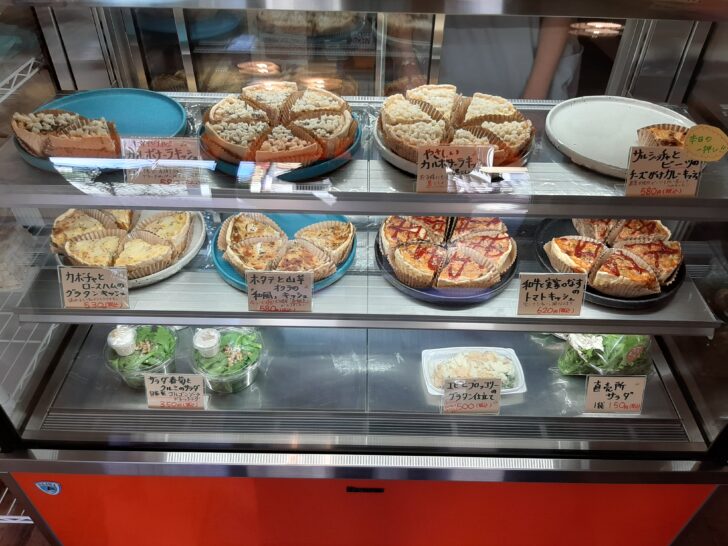 訪問したのは、土曜日の開店直後ですが、もう結構売れていました。本日のキッシュは、カルボナーラキシュ、カボチャとロースハムのグラタンキシュ、和牛と実家のなすのトマトキシュ、サルシッチャとビーツのチーズガケカレーキシュ、ホタテと山芋・オクラの和風キシュの4種類ですね。おかず系はまだ、これから出てくるものもありそうです。