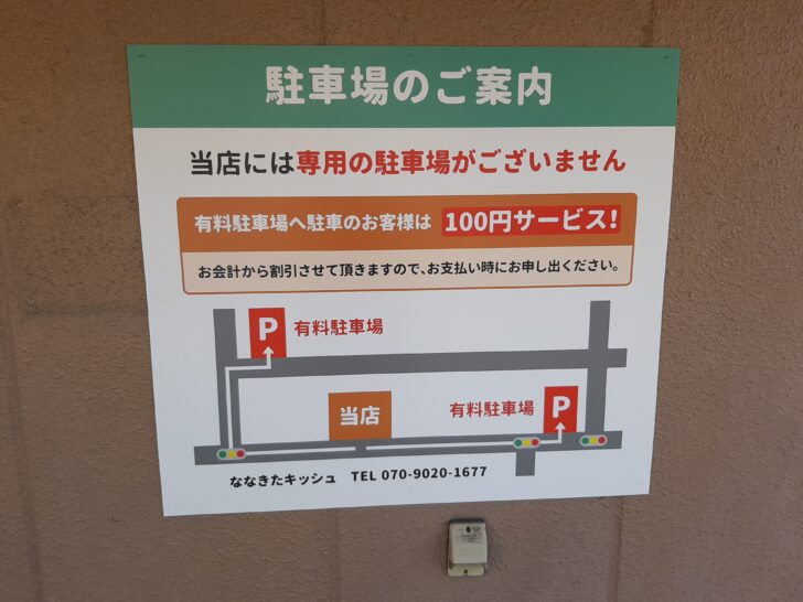 専用駐車場がないので、近くの有料駐車場へ駐車した場合は、会計から100円割引して貰えます。これは、嬉しいサービスですね。