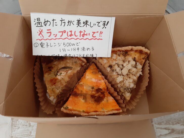 今回は、一番人気のオリジナルカルボナーラキッシュ【580円】、サルシッチャとビーツのチーズがけカレーキッシュ【580円】、ホタテと山芋・オクラの和風キッシュ【580円】の3個を購入しました。米粉フォカッチャを購入したかったのですが、焼き上がるのが11:00~だったので購入できませんでした。キッシュはこんなケーキBOXに入れてくれます。
