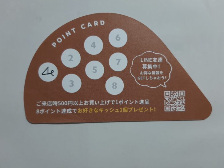 こんなPOINT CARDも発行していました。500円以上購入で1ポイント貰えます。8ポイント達成で、キッシュ1個貰えるようです。
